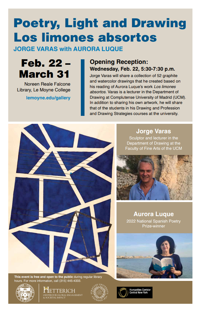Poetry Light and Drawing / Los limones absortos es una propuesta cultural en la que confluyen dos practicas artísticas que históricamente estrechan su relación cuando se empiezan a escribir los versos, la palabra se cosifica y la poesía pasa de la oralidad al texto, antes incluso que Simonides de Ceos manifestara que La poesía es pintura que habla, y la pintura poesía muda. La propuesta contó con una exposición en la Noreen Reale Falcone Library de Le Moyne College de Syracuse (NY) entre los días 22 de febrero y 31 de marzo, una lectura poética realizada por la escritora Aurora Luque (Premio Nacional de Poesía 2022) y una clase sobre el desarrollo del trabajo gráfico que compone la exposición.