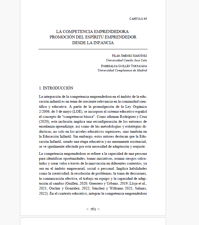 Jiménez Martínez, P., & Guillén Tortajada, E. (2024). La competencia emprendedora: promoción del espíritu emprendedor desde la infancia. En Diálogo frente a espejismo: ensayos sobre pensamiento y sociedad en el mundo contemporáneo (pp. 763-779). Dykinson.
